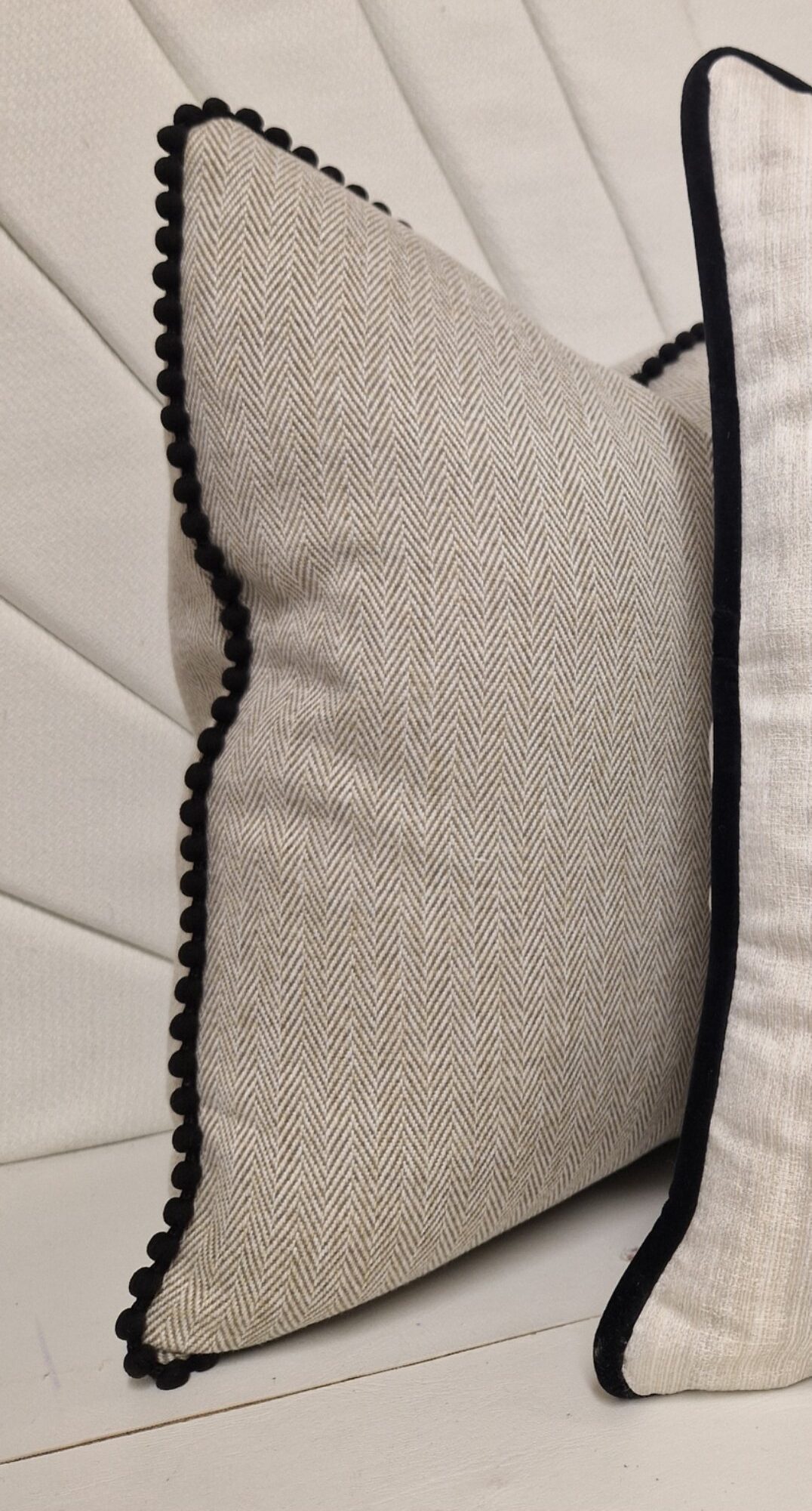 Flynn Smoke with Black Mini Pom Poms – A textured on trend fabric that looks great either on your sofa or bed. This colour works so well with this black contrast fringe. It beings eye catching style to your home.