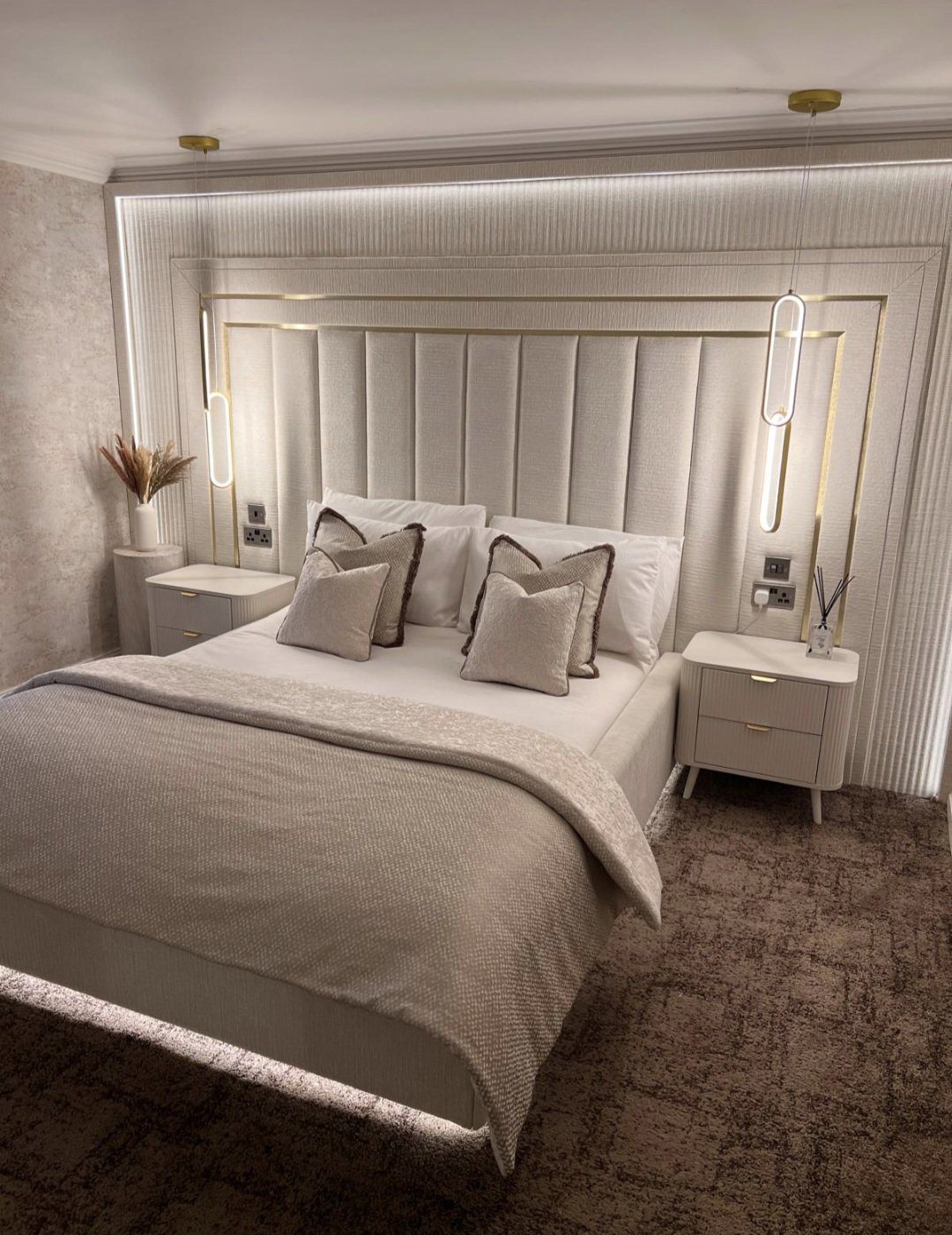 It consists of 2x 20″ Liese Fawn cushions with taupe fringing and 2x 16″ Sohi Pearl with contrast taupe velvet piping.
